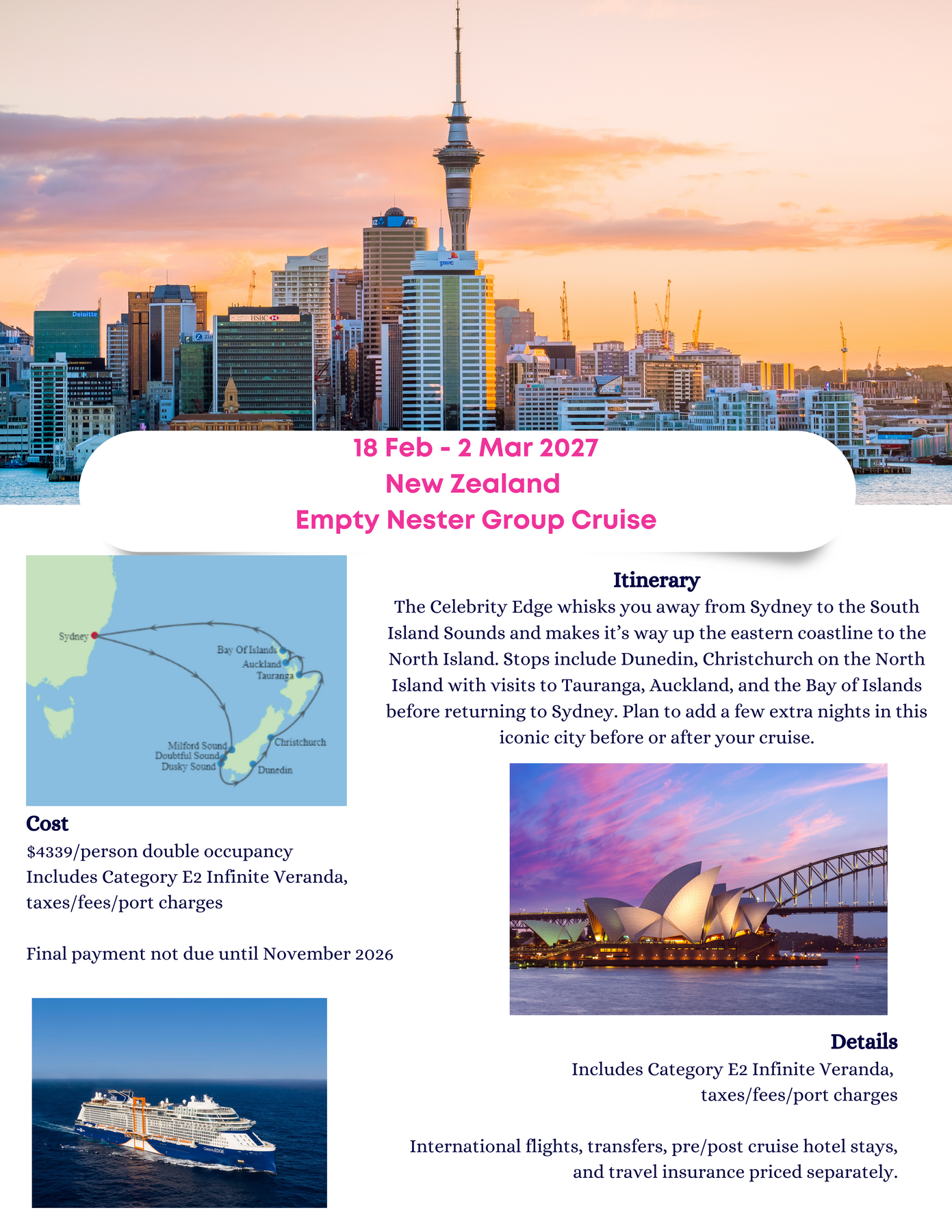 International flights, transfers, pre/post cruise hotel stays, and travel insurance priced separately