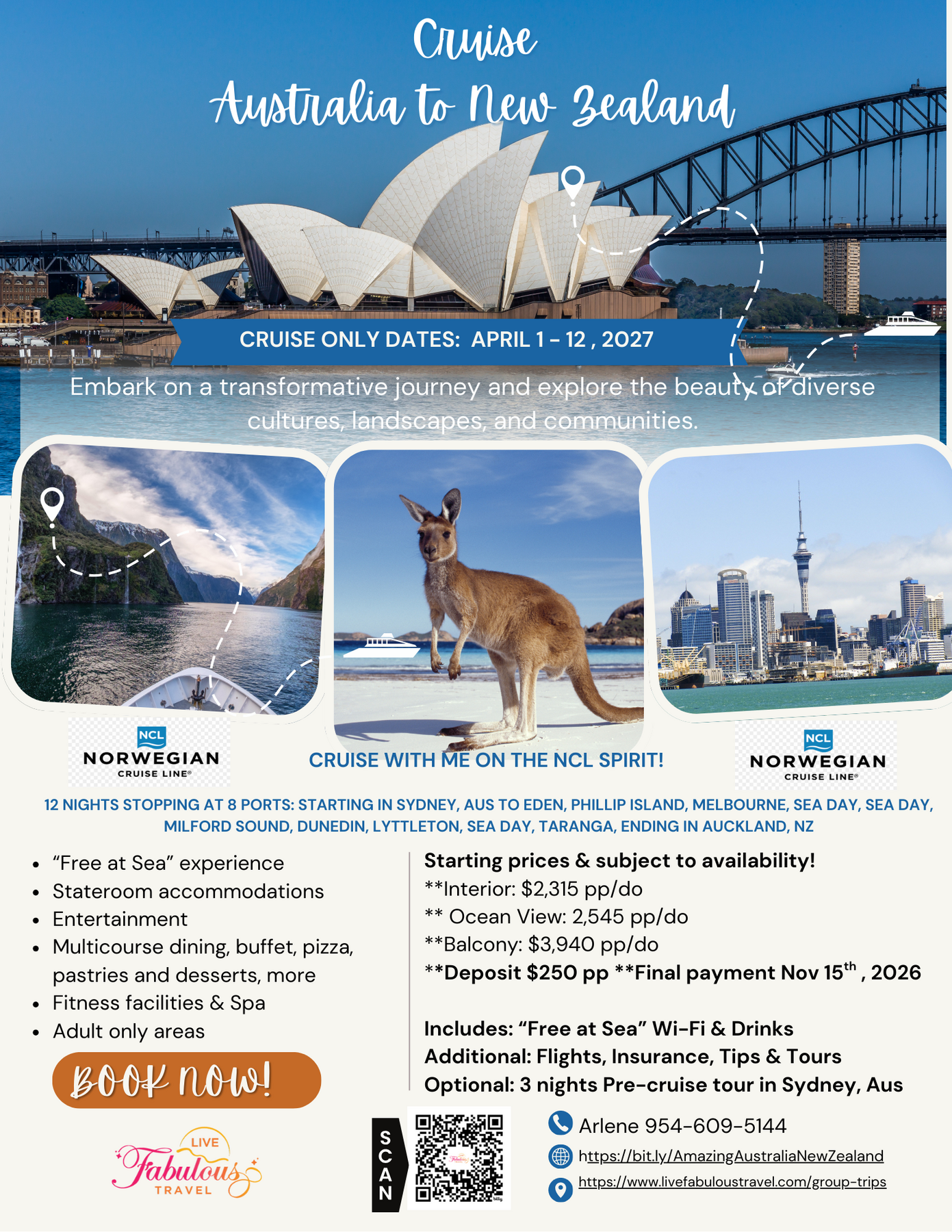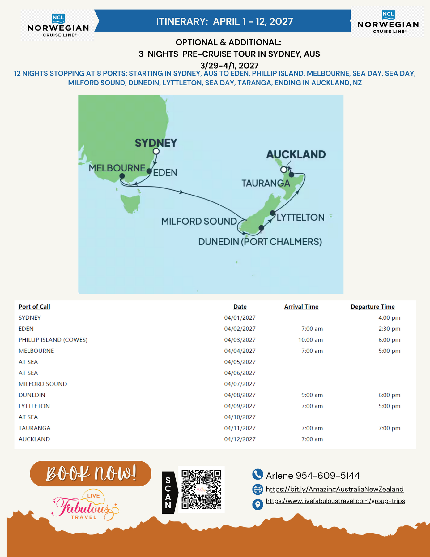 Starts from: Sydney, AU to Eden, Phillip Island, Melbourne, sea day, sea day, Milford Sound, Dunedin, Lyttleton, sea day, Taranga, ending in Auckland, NZ
