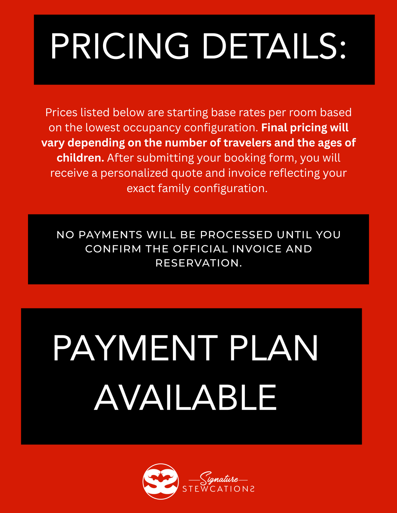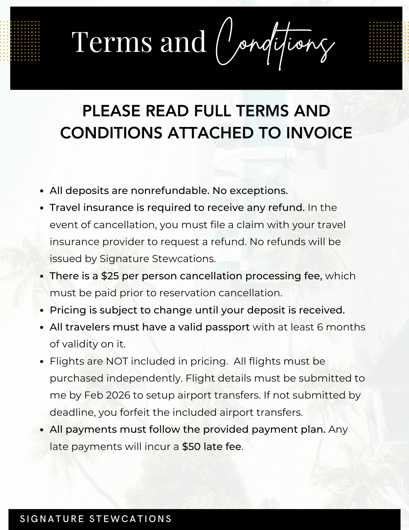 All deposits are nonrefundable. Without Travel Insurance, any cancellation may result in the loss of your full investment — especially within 60 days of travel. Refunds are not issued by Signature Stewcations. To receive any potential refund, you must purchase travel insurance within 7 days of booking and file a claim directly with the provider. Travel Insurance is strongly recommended to protect your trip and your funds.
