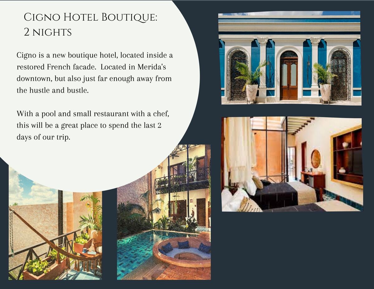 I've carefully chosen the hotels to bring a sense of place into our trip. Two boutique hotels in Merida are VERY well known for their culinary offerings. The other two are haciendas from the 17th century that have been lovingly restored to luxury hotels which are currently owned by Marriott. You'll be amazed by the architecture and style of all 4 hotels, and the level of service and food provided.