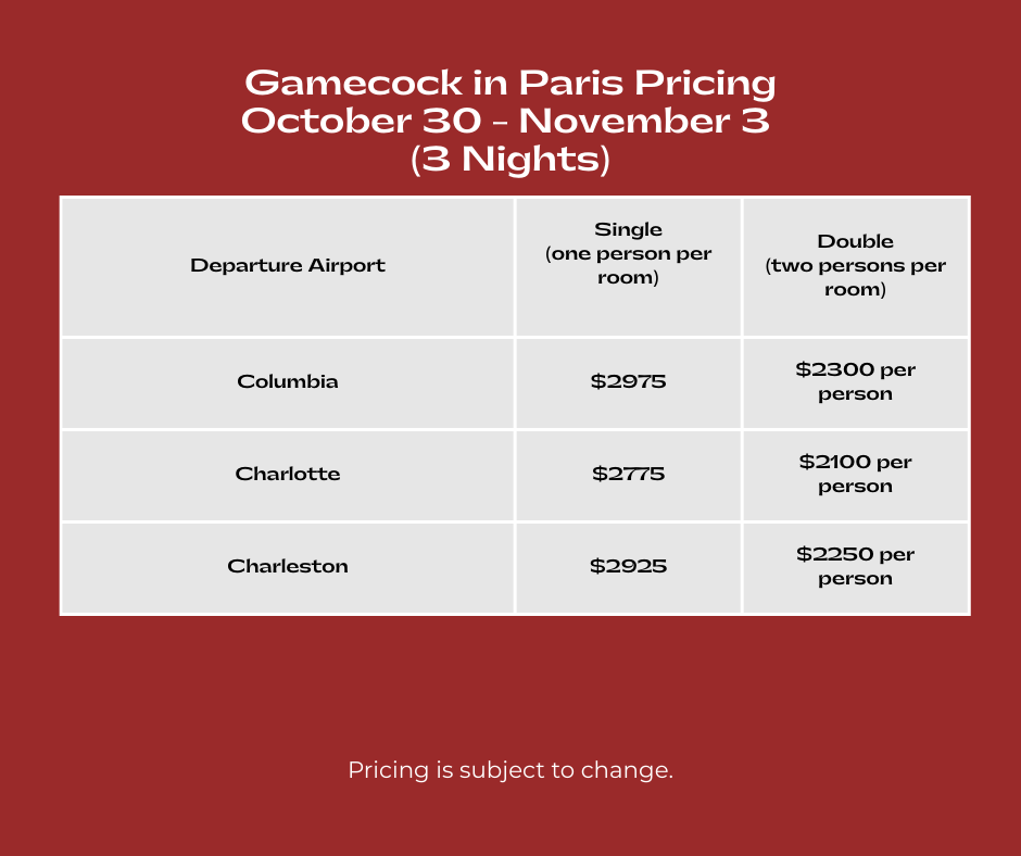 Pricing and availability are not guaranteed until a deposit is made. If the selected room category sells out, you will be placed in the next best available option and notified.
