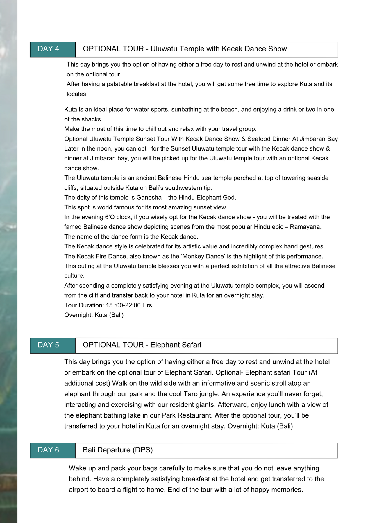 After the optional tour, you’ll be transferred to your hotel in Kuta for an overnight stay.