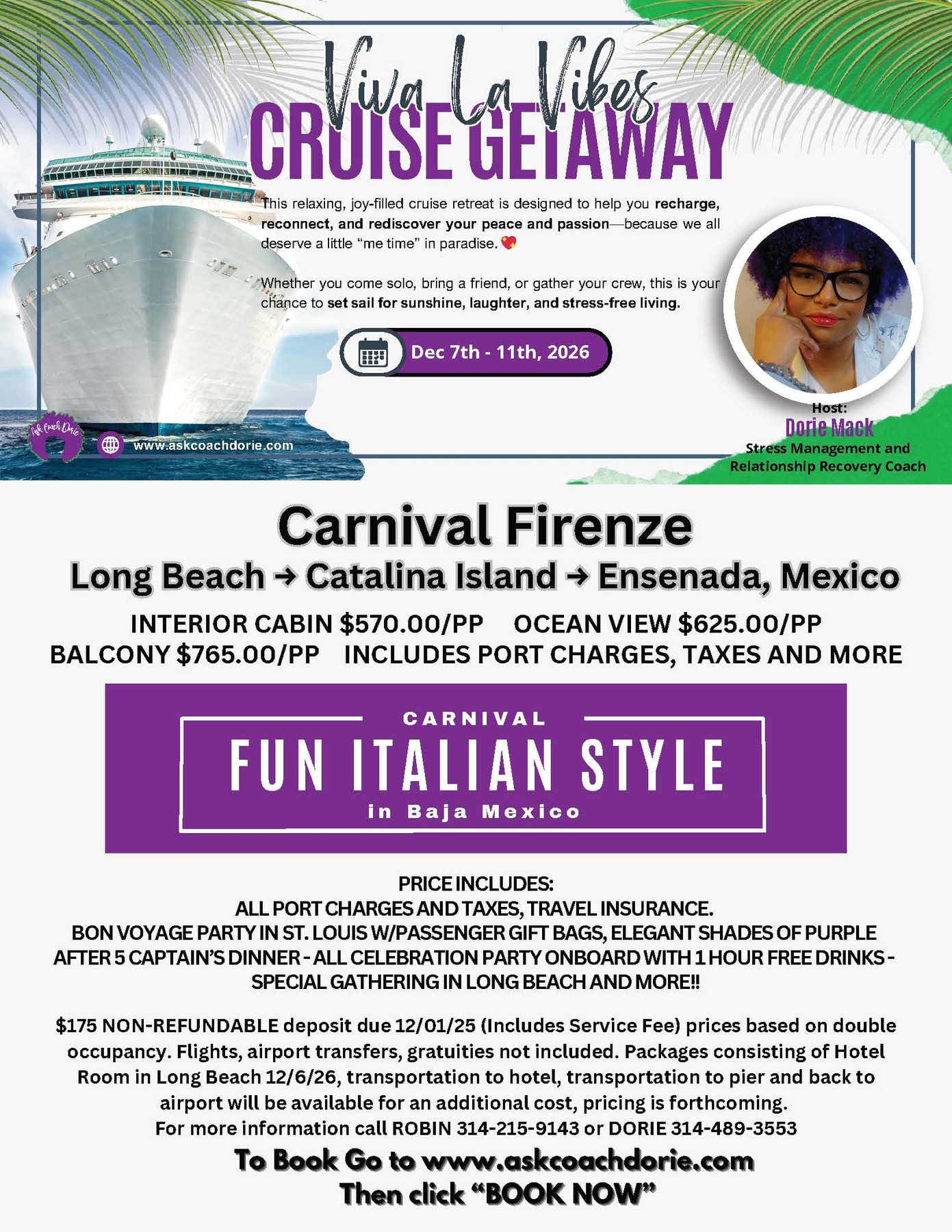 Join Coach Dorie Mack and Dynamic Transformations for “Viva la Vibes: The Stress-Free Cruise Getaway”—a five-day, soul-refreshing adventure aboard the beautiful Carnival Firenze, sailing from Long Beach, CA to Catalina Island and Ensenada, Mexico!