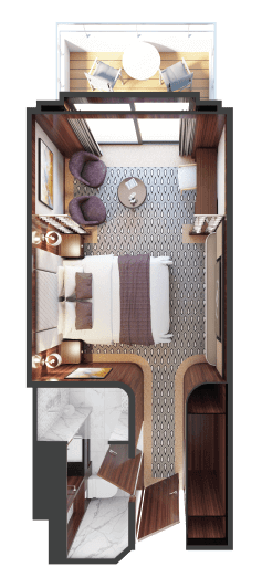 Breathe easy in our most spacious Navigator Suite. A generous balcony with entrances from the bedroom and living room gives way to incredible views. Enjoy the perfect balance of indulgent nights aboard after thrilling days ashore.