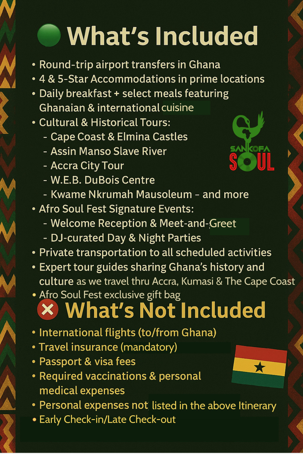 If one roommate cancels before The Afro Soul Fest takes place, the remaining roommate has up to 60 days before the trip date to find a replacement. If they don’t find a replacement roommate they will be charged the remaining unpaid room balance for the other party. If they choose not to pay the new remaining balance owed, their reservation will be canceled, and they will need to seek a refund through their travel insurance. No Exceptions.