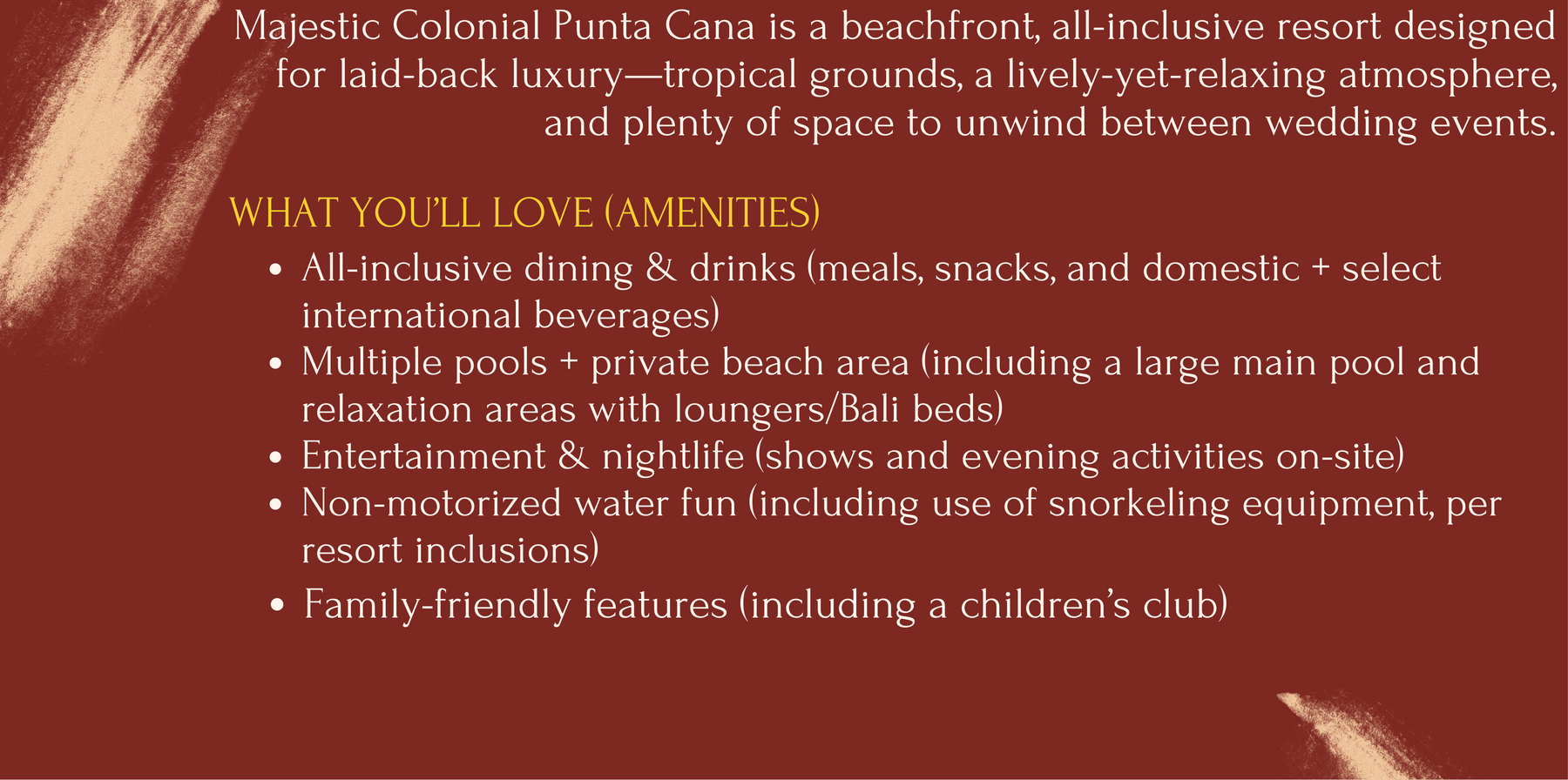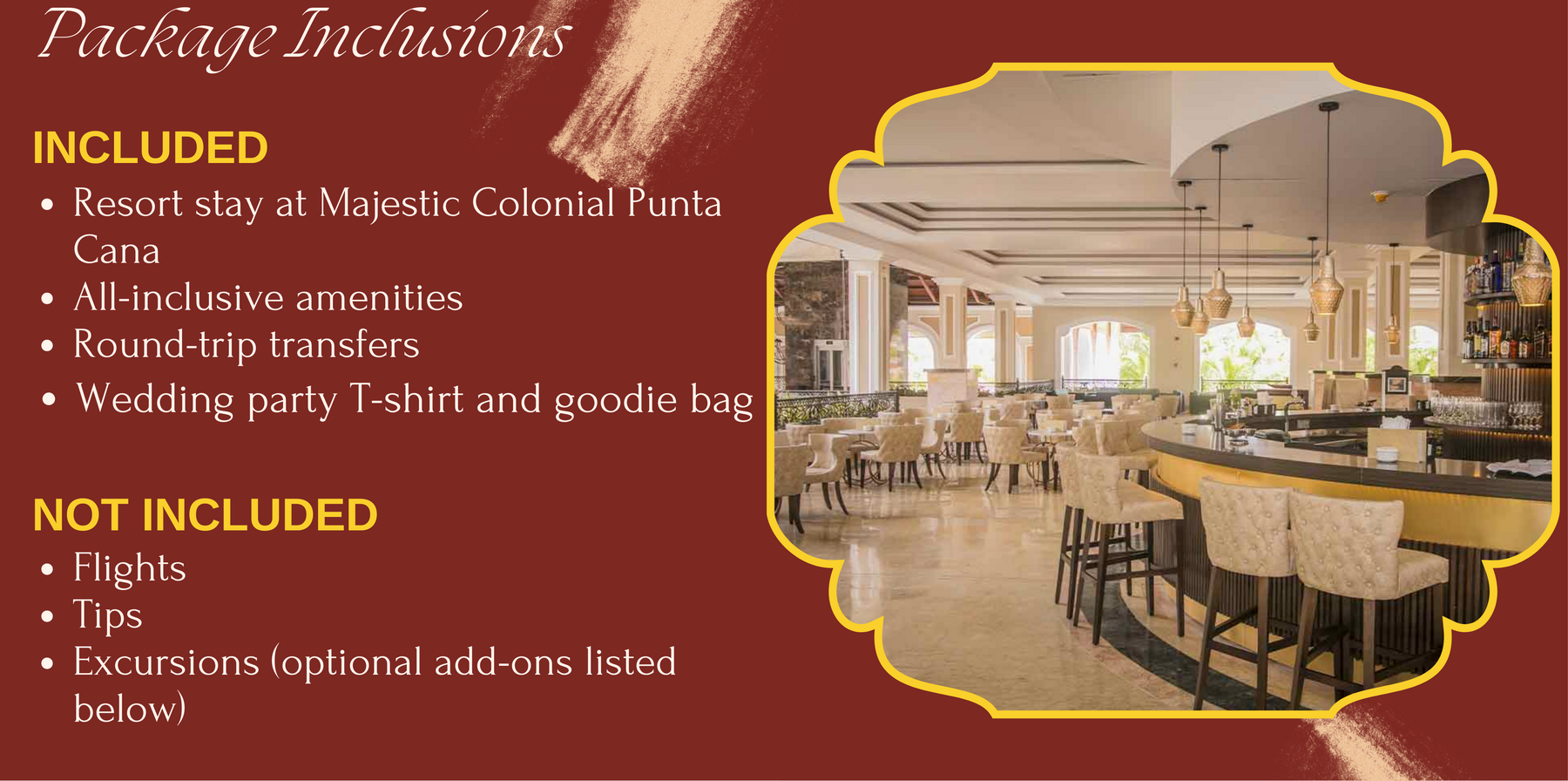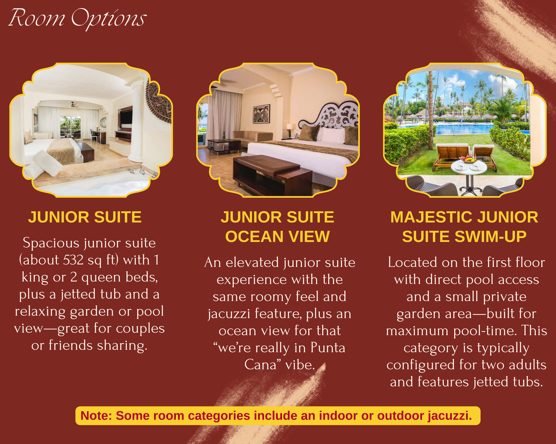 A junior suite option with an ocean-view backdrop and jacuzzi features - perfect if you want a more elevated view for your downtime between wedding events.Package Includes: