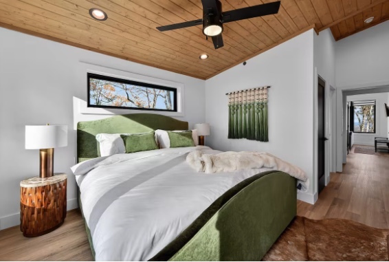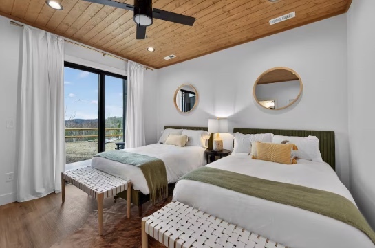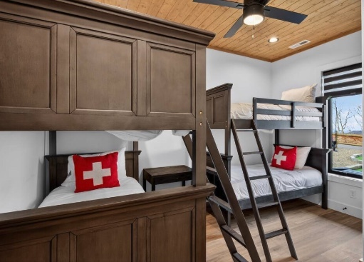 A thoughtfully designed bunkroom with four twin beds—perfect for friends—creating a fun, comfortable sleep space that feels inviting, relaxed, and ready for late-night laughs and memories.