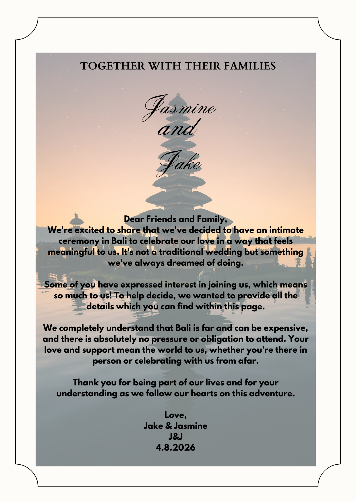 Please note that Jasmine and Jake have graciously covered the cost of the accommodations. In the event that you cannot attend please let them know by January 1st 2026.