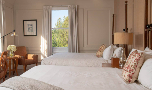 Room 201 is located on the second floor of the Mansion overlooking the English Gardens and a glorious sunrise. This spacious room is furnished with 2 queen-size beds, a desk, large flat-screen TV, and an in-room refrigerator. The private en-suite bath features a whirlpool tub with rain shower.