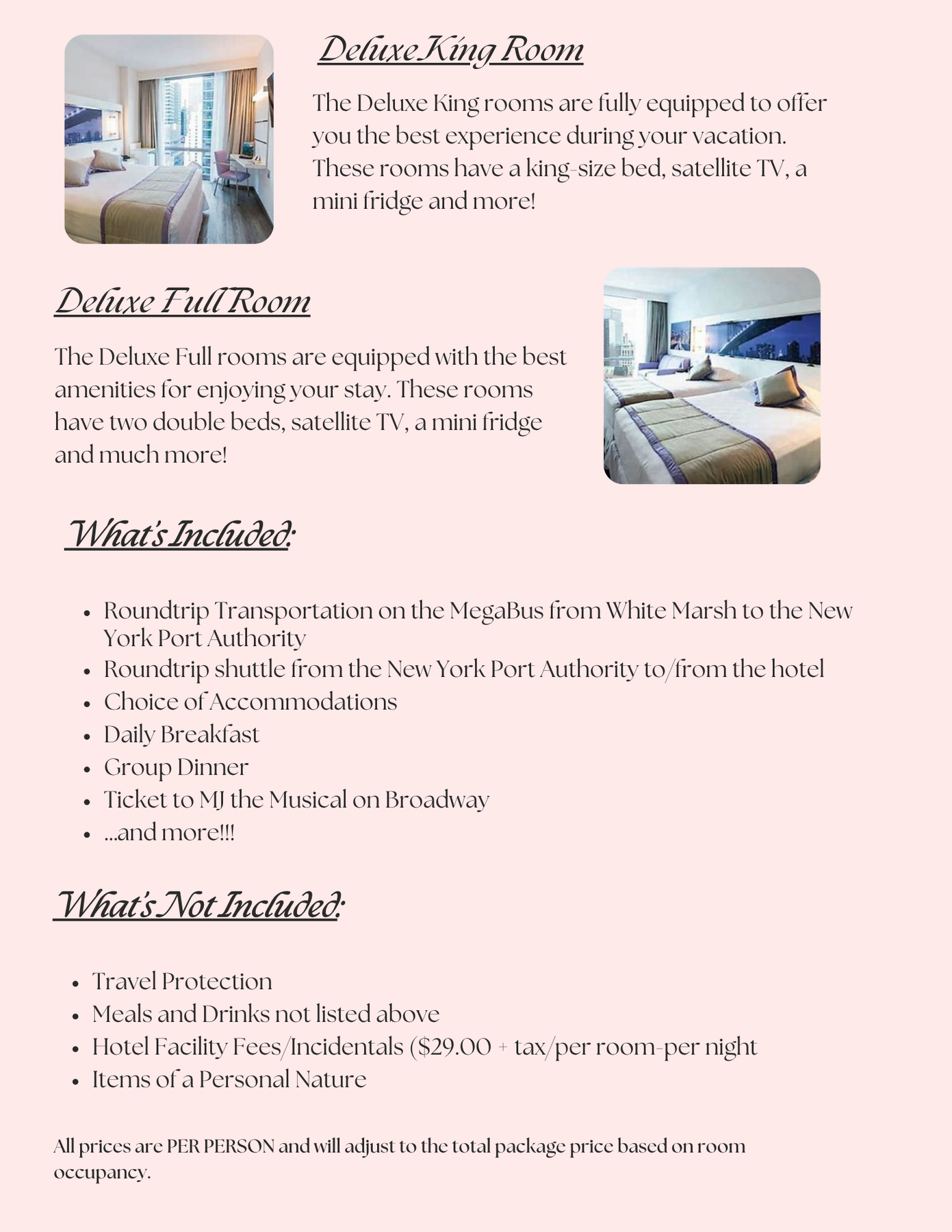 The Deluxe Full rooms are equipped with the best amenities for enjoying your stay. These rooms have two double beds, satellite TV, a mini fridge and much more!