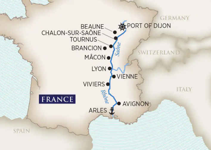 *Please be advised the ship will be docked in Saint-Jean-de-Losne and is located approximately 30 minutes’ walk from the train station. Purchasing one of our transfer options between Dijon and Saint-Jean-de-Losne is strongly recommended for guests embarking on our 7-night cruise without a pre-cruise land package.