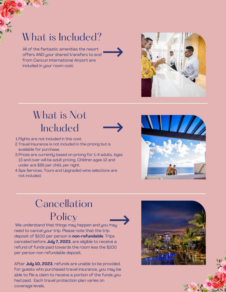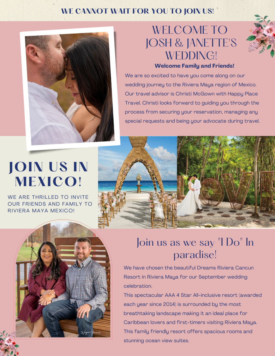 However, it is recommended that you consider a minimum of a 4 night stay. Arriving on the resort a few days prior to Janette and Josh's wedding gives you time cushion for potential delayed or canceled flights. Most flights from the middle of the US will arrive in Cancun in the afternoon. If you arrive the day prior to the wedding, you may not be giving yourself enough cushion of time to allow for potential flight cancellations and delays or luggage delays.