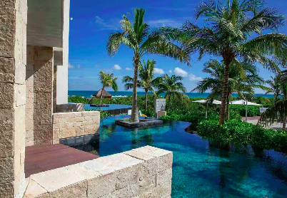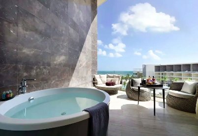 Luxurious two-story suite just steps from the beach. Sit in the private jacuzzi with a drink in hand. This loft suite is complete with a full bar, a stunning terrace with a jacuzzi for two, a rainfall shower set in marble, and a standalone hydromassage bathtub