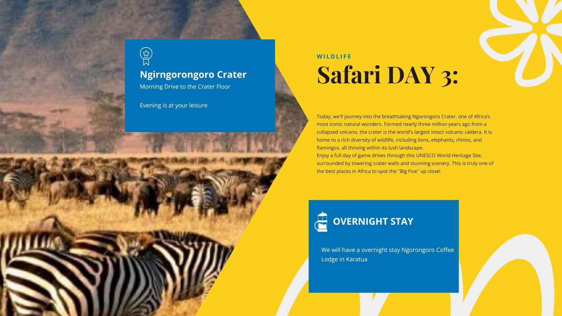 Unlimited Game Drives with Window Seating: Enjoy unlimited game drives in Tanzania's renowned national parks, including Ngorongoro Crater and Tarangire National Park, with guaranteed window seating for the best views.