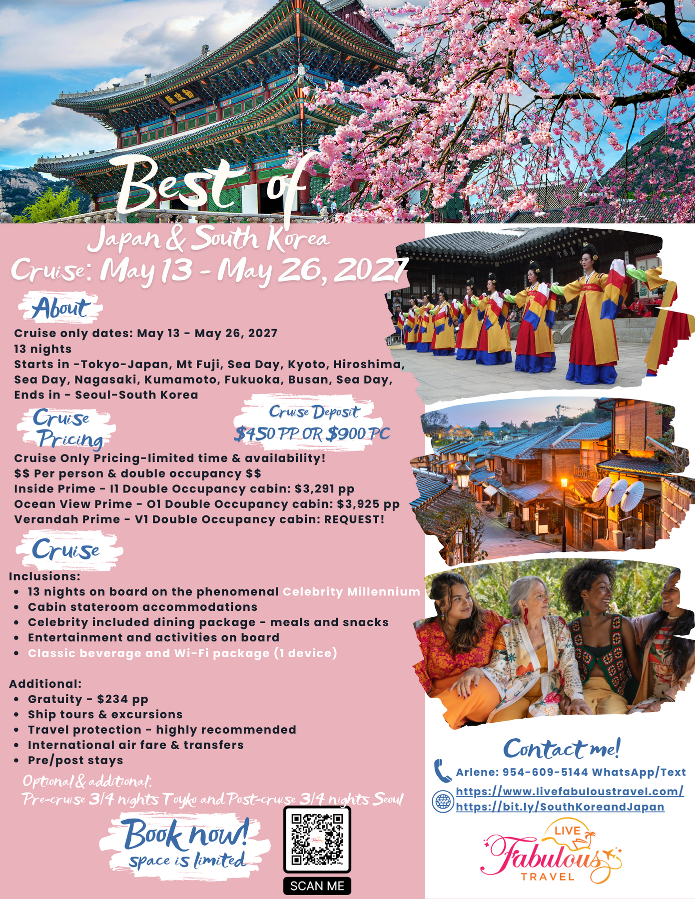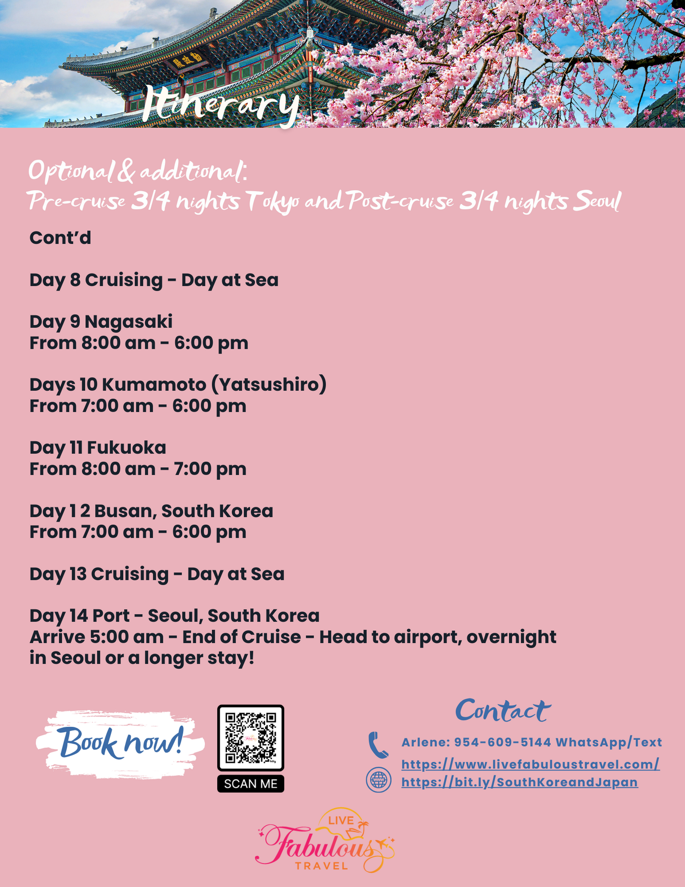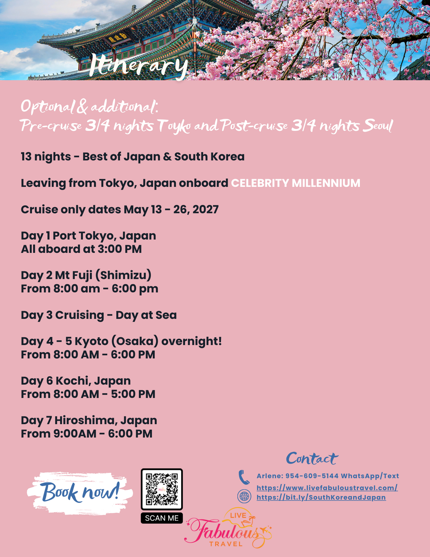 OPTIONAL & additional: pre-cruise 4 nights/3 days Tokyo and post-cruise 4 nights/3 days Seoul.