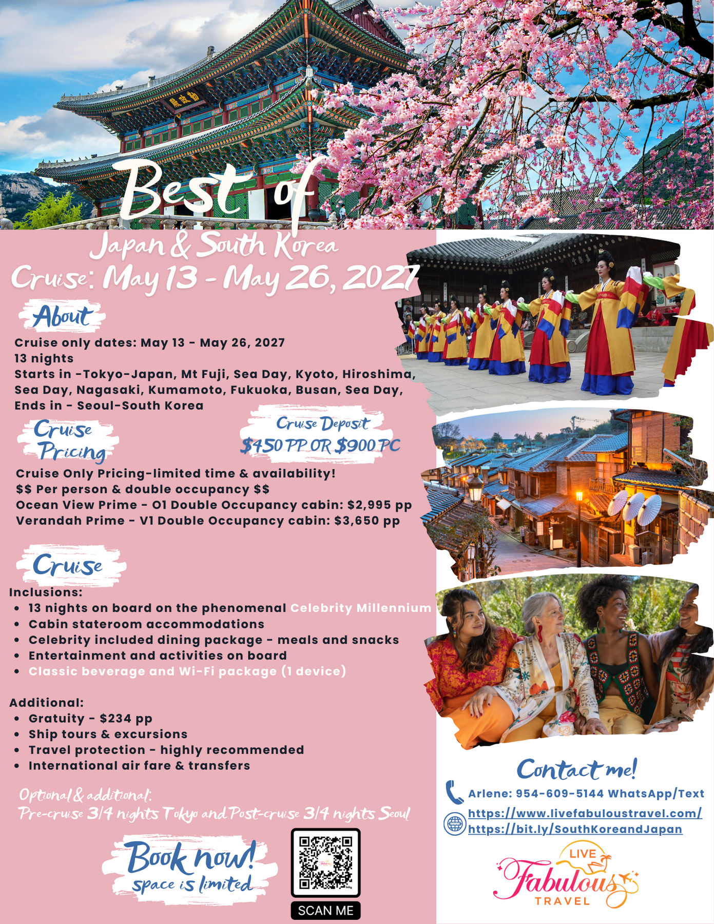 OPTIONAL & additional: pre-cruise 2 nights Tokyo and post-cruise 2 nights Seoul.