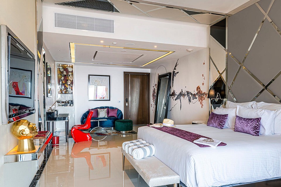 The Mousai Suite features 1,061 square feet inspired by nature’s muses, including a spacious terrace of nearly 382 Sq Ft. Purple is the iconic Mousai color which plays against the elegant gold and stainless-steel touches. Featuring a workspace, sitting area, flat-screen TV, an oversized en suite bathroom with a rain shower, automated bidet toilet, dual vanity sinks, walk-in closet, and bespoke furnishings.