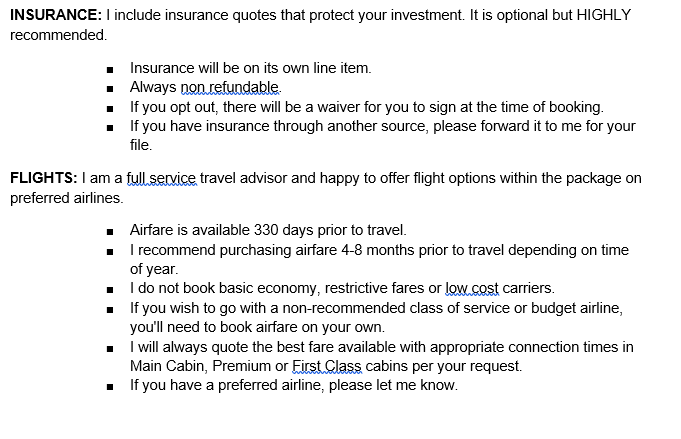 Things to know before you go: Approximately two weeks prior to travel you’ll begin receiving information from me to prepare your vacation.