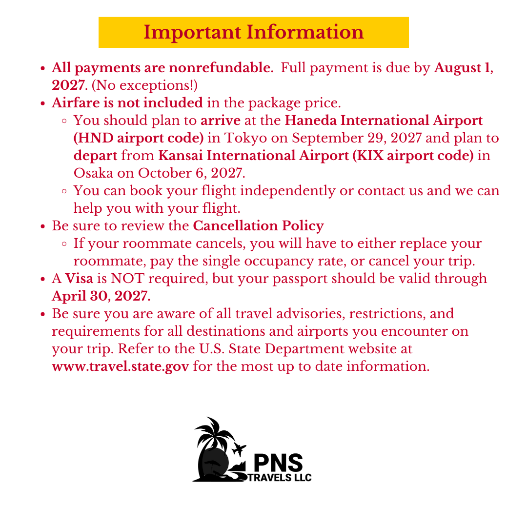 The full trip balance owed is due by August 1, 2027. NO EXCEPTIONS!!