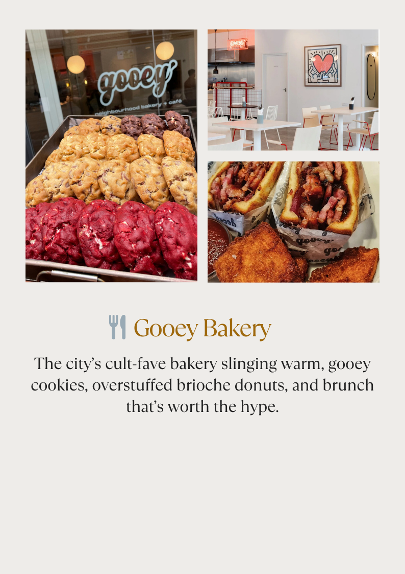 Gooey – The sweet finale with famous cookies, donuts, and bakery treats.