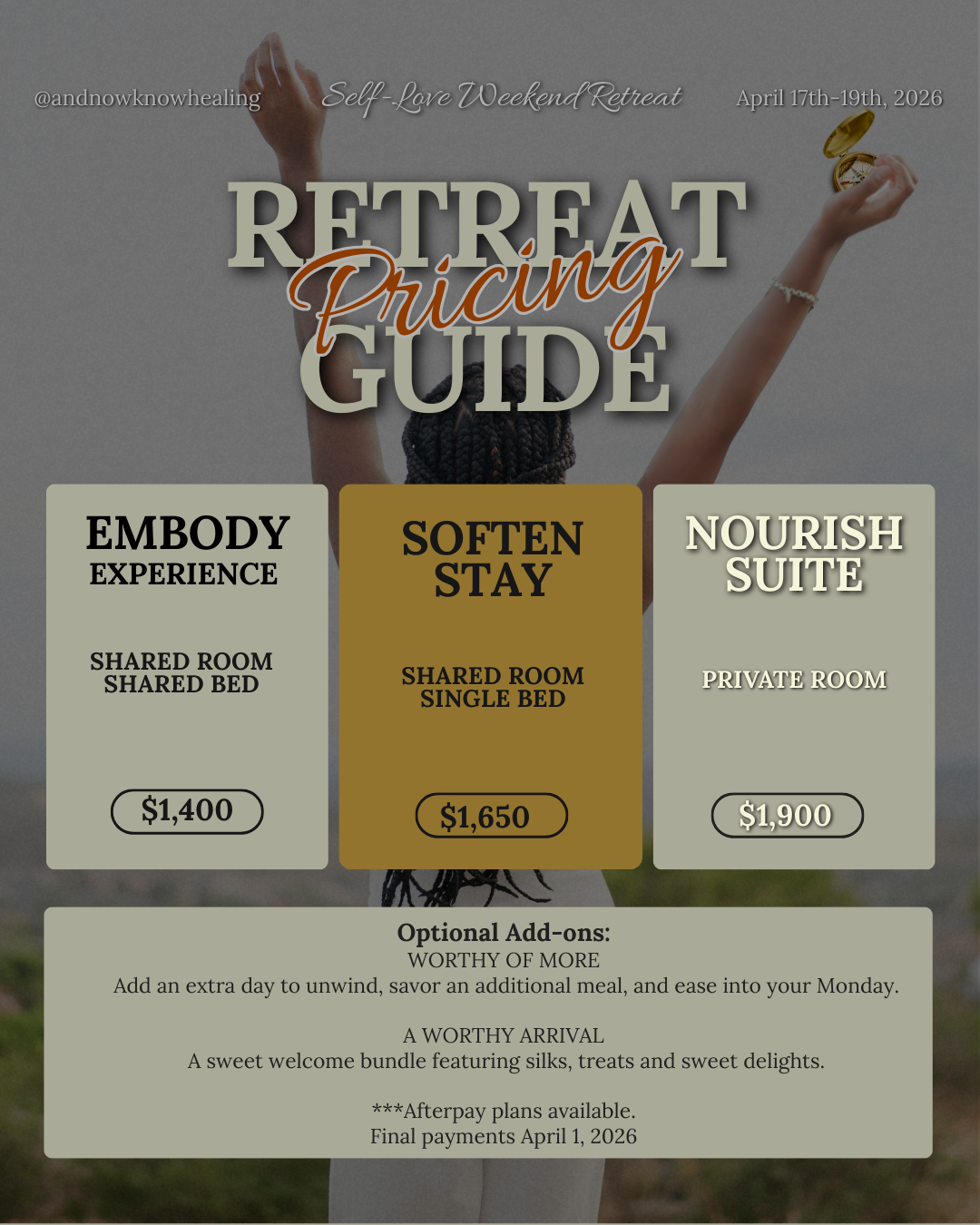 You will pay the deposit listed for your selected room type at booking. The remaining balance is due before April 1, 2026.