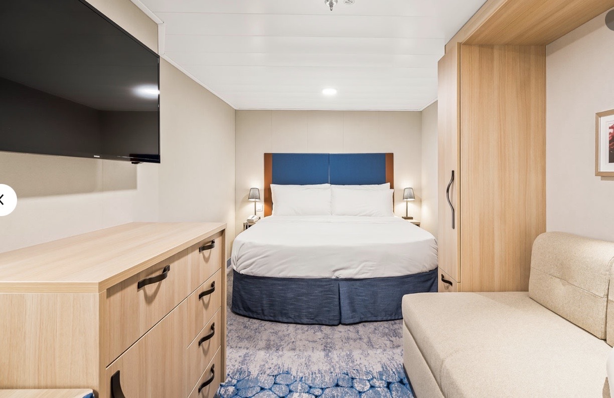 Enjoy all the comforts of an interior stateroom - Perfect for travelers who love a cozy, budget-friendly option without feeling closed in, this stateroom includes two twin beds that convert to a Royal King, a sitting area, a private bathroom, ample storage, and thoughtful design touches that maximize space and comfort.