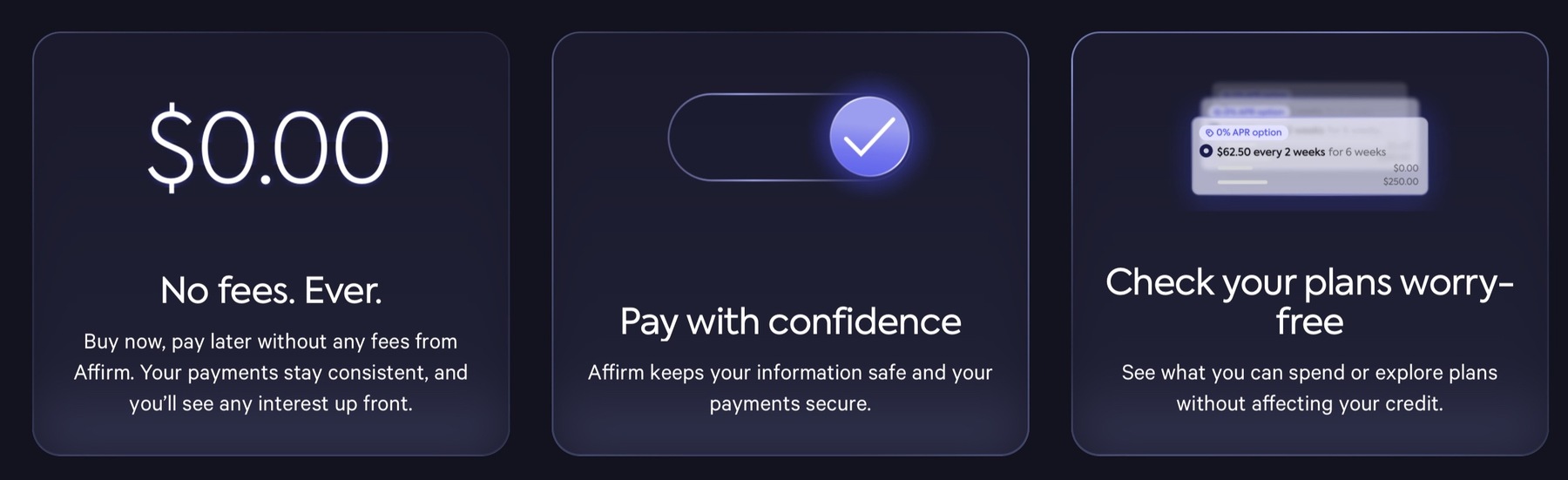 Rates from 0–36% APR. Terms may vary by merchant. Payment options through Affirm are subject to an eligibility check, may not be available everywhere, and are provided by these lending partners: affirm.com/lenders. For example, a $800 purchase might cost $72.21/mo over 12 months at 15% APR, or 4 interest-free payments of $200 every 2 weeks. Options depend on your purchase amount, and a down payment may be required. For licenses and disclosures, see affirm.com/licenses