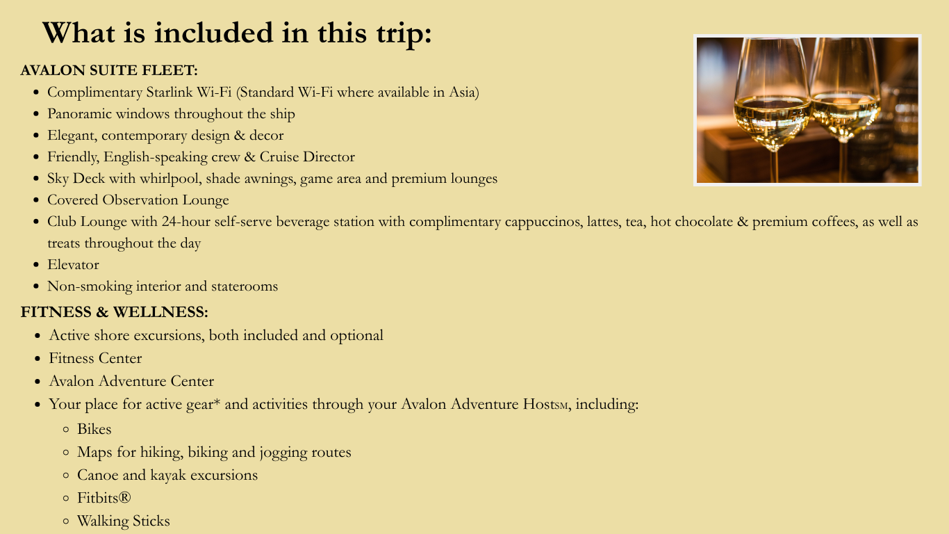 To reserve an Avalon river cruise, a deposit of $250 per person (non-refundable) is required at time of booking. Final payment is due no later than Friday, July 24, 2026; non-payment may result in the reservation being cancelled. Adams Global Travel will set up monthly payment reminders for you or you can pay at any time in any amount up until the final payment date. Please note that if you purchase travel protection, this amount is also due at the time of your initial deposit.