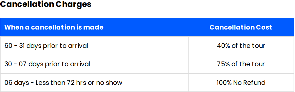 Deposits ($300) and admin fee ($100) per person are non-refundable. However, if canceled more than 60 days before the travel date, you can transfer it to another date or trip. If canceled less than 60 days before the trip, deposits are non-refundable and nontransferable. For the balance amount, the below cancellation fee will be applicable:Â