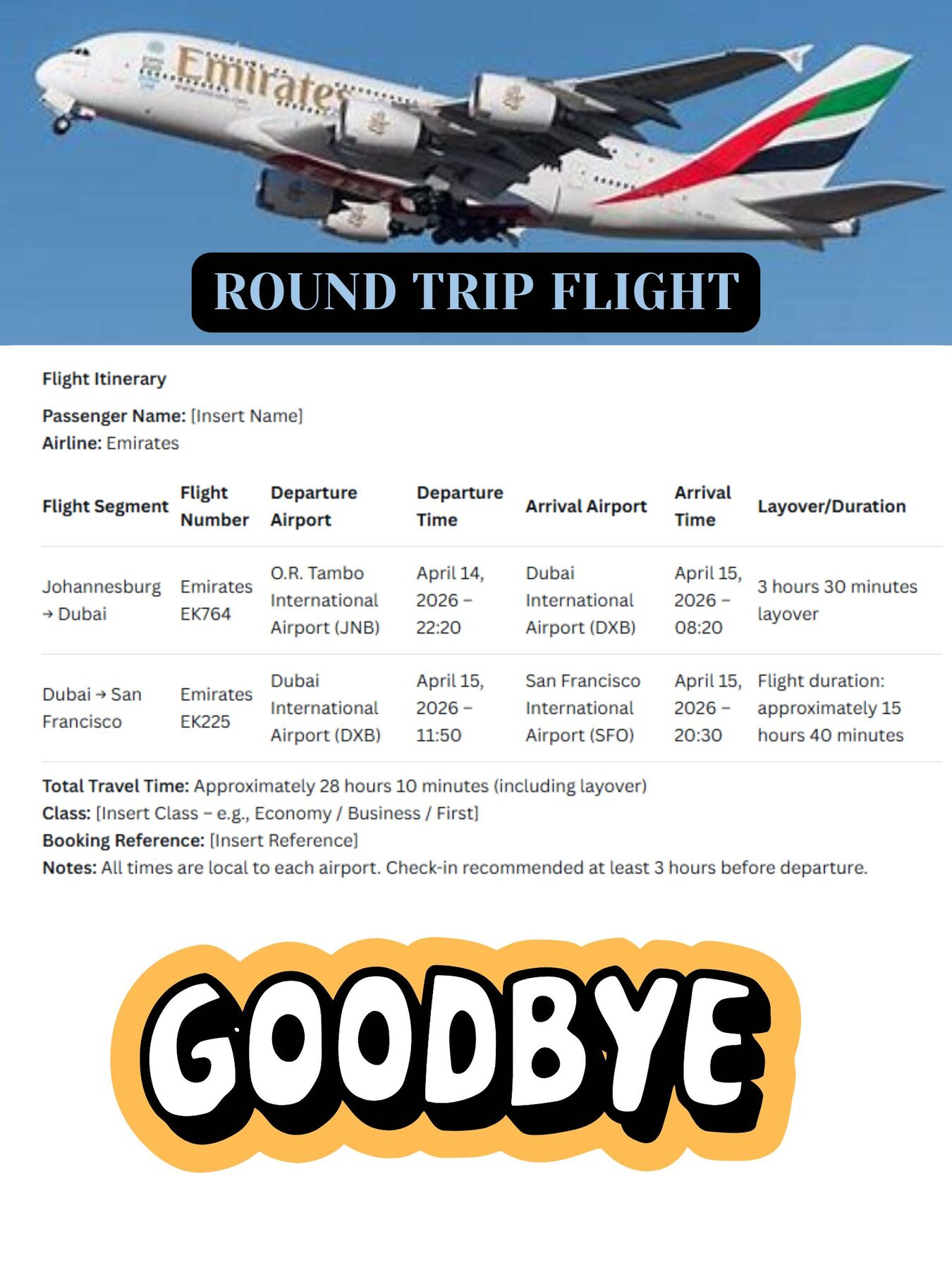 📍 Journey: Johannesburg (JNB) → Dubai (DXB) → San Francisco (SFO)