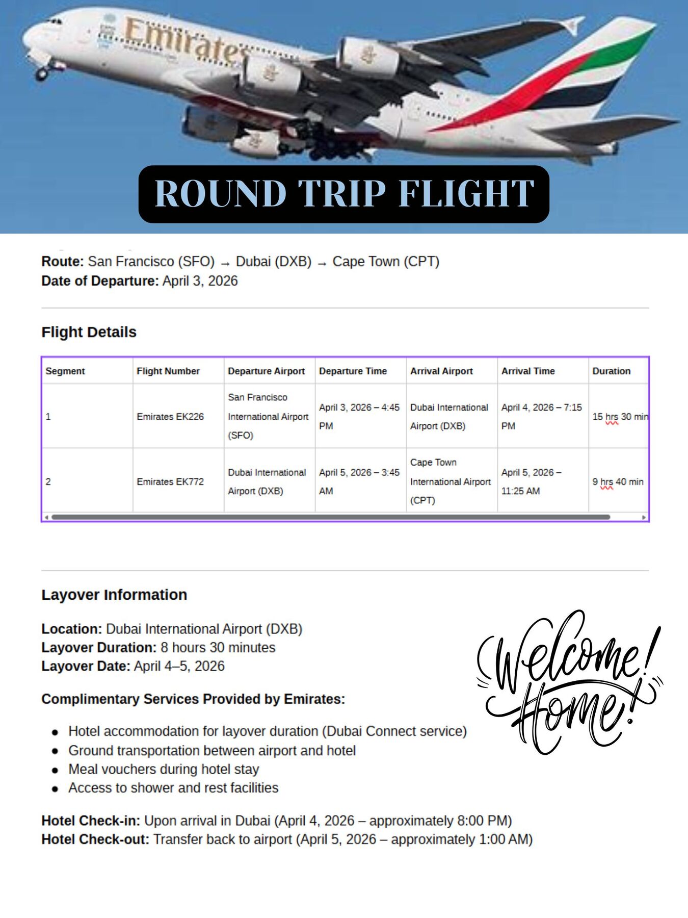 📍 Journey: San Francisco (SFO) → Dubai (DXB) → Cape Town (CPT)