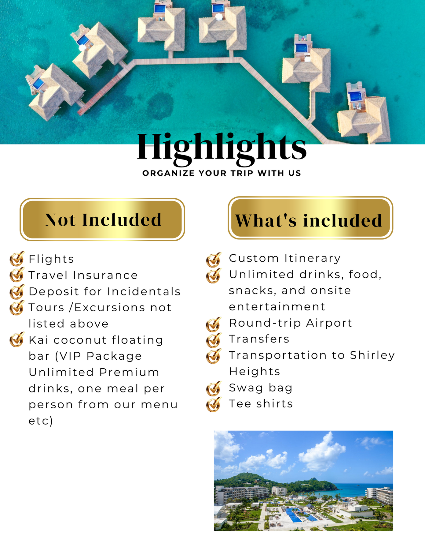 “Kaikoconut party queen” with Unlimited Premium drinks, 1 meal per person ( can purchase more ) , waitress service, access to waterslides, and VIP shuttle service to the boat.